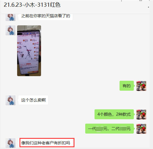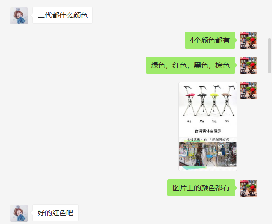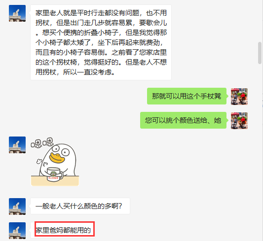 三月的第一天,刚开始上班手机便叮咛响,是微信来了新消息:李女士咨询关于家里老人可以行走,但走不远就腿累,适合什么颜色的手杖凳?我这边发了4款颜色给她,并详细问了使用者的身高和体重,以及日常对色彩的喜好等,建议女士选玫红色和绿色,适合春天的颜色且外出使用比较显眼,不容易遗忘和丢失。李女士在我的建议下果断觉得要了粉红色的二代折叠手杖凳。