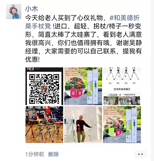 热心的李女士在自己为父母选到了合心意的拐杖凳以后还主动帮忙分享到朋友圈,希望更多的朋友知道这个出行好物,帮助老人们度过更美好幸福的春天。